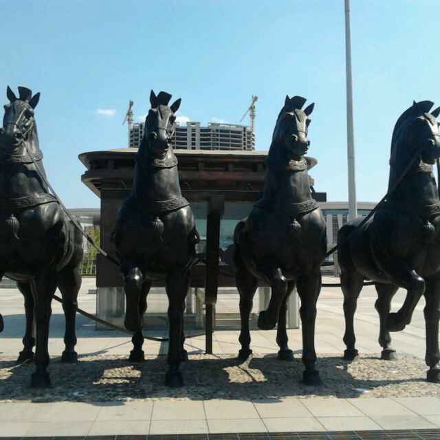 濟(jì)南西客站東廣場疏散口銅車馬雕塑群,材質(zhì):青銅鑄造、鍛銅;長度15米,高度4.5米;共6組。 雕塑以四馬一車為一組,自高鐵西站東廣場